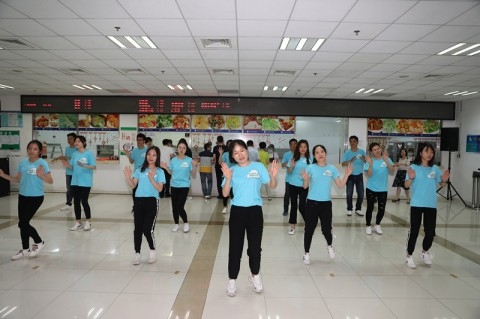 在节能主题快闪专场,员工们在食堂内身穿蓝色衣物,身贴“低碳生活,健康你我”徽标,共同跳起了海草舞,用自己的身体力行诠释环保、健康、绿色这一主题。
