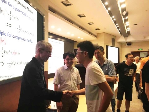 Russel E. Caflisch在报告中以图像消噪、修补与图形分割为例讲解了微分方程的变分方法与非线性扩散的思想在图形与数据分析中的应用,介绍了压缩感知与机器学习等信息科学中的新思想,并由此引出了微分方程与数值计算中的相关应用。他还举例介绍了方程具有紧支集的解,由变分方法推导出的微分方程的“压缩模式”以及机器学习在微分方程与物理方面的应用等。
