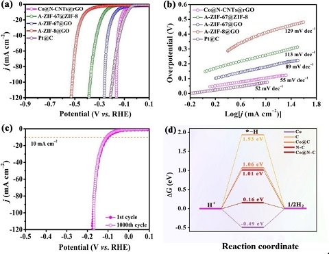 Co@N-CNTs@rGO催化剂的(a)LSV曲线、(b)塔菲尔斜率、(c)循环稳定性和(d)Co、C和N成分对析氢反应活性影响的理论分析