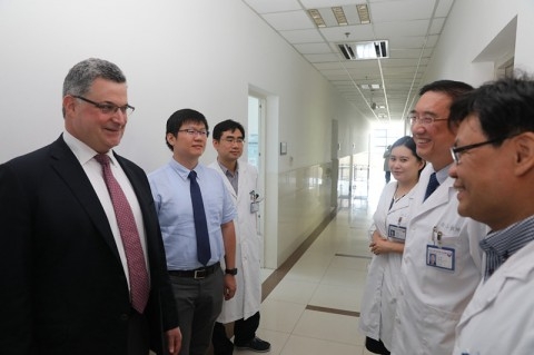 双方就医院合作、医院目前的状况、未来发展、以及呼吸病研究方面进行了探讨,并参观了DSA、放疗中心、呼吸科及肿瘤科病房。附属金山医院与西奈山呼吸病研究所就深化双方全面促进医学、教育和科学研究领域的交流与合作,从事先进医学研究,定期进行学术交流等方面签订了合作备忘录,希望创造一个双方互利共赢的共同体。