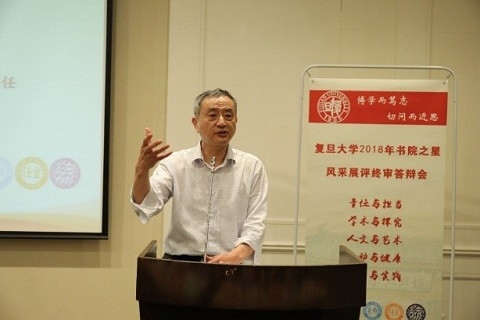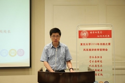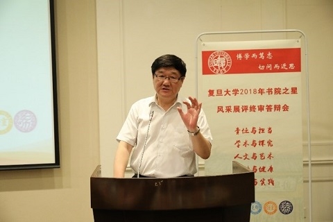 6月26日晚,复旦大学2017—2018学年“书院之星”风采展评终审答辩会在光华楼东辅楼101室举行。此次“书院之星”评比活动旨在评选、表彰在责任与担当、学术与探究、人文与艺术、创新与实践、运动与健康等方面“德才兼备、全面发展”的书院学子。本科生院院长吴晓明,原复旦大学副校长、教师教学发展中心主任陆昉,校长助理、本科生院常务副院长兼教务处处长徐雷及各相关部处和书院导师代表出席本次答辩会。