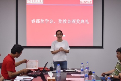 7月6日,首届睿郡创新奖学、奖教金颁奖仪式在信息科学与工程学院举行。复旦大学校团委副书记耿昭华、信息科学与工程学院党委副书记黄芳和上海睿郡资产管理有限公司总经理缪钧伟共同为获奖师生颁奖。耿昭华向上海睿郡资产管理有限公司赠送了纪念品。学院光科学与工程系40余名师生参加颁奖仪式。