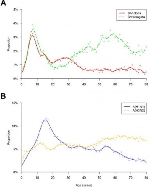 图2. B/Yamagata系、B/Victoria系与A型流感的年龄分布