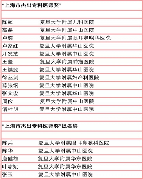 经过推荐申报、资格审核、专科医师分会初评、评审专家复评,17位复旦医务工作者获得第二届 “仁心医者·上海市杰出专科医师奖”,名单如下: