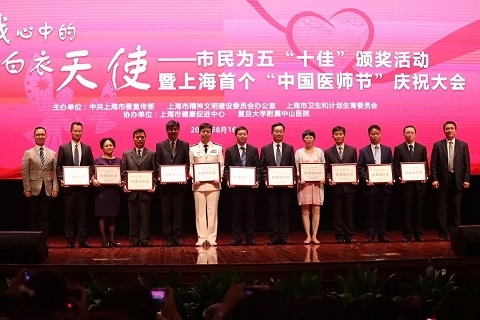 在首个中国医师节来临之际,为大力弘扬 “敬佑生命,救死扶伤,甘于奉献,大爱无疆” 的崇高精神,上海市委宣传部、市文明办、市卫生计生委8月16日在复旦大学附属中山医院举行“我心中的白衣天使——市民为五‘十佳’颁奖”活动暨上海首个“中国医师节”庆祝大会。