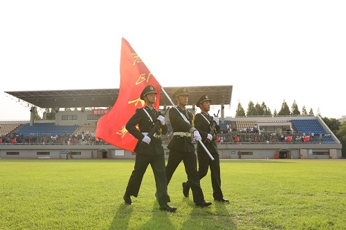 迎校旗仪式后,25个连队整理队形,进行分列式汇报表演,依次走过主席台接受检阅;参训学生代表与军训团承训教官分别进行军体拳及擒敌拳表演。