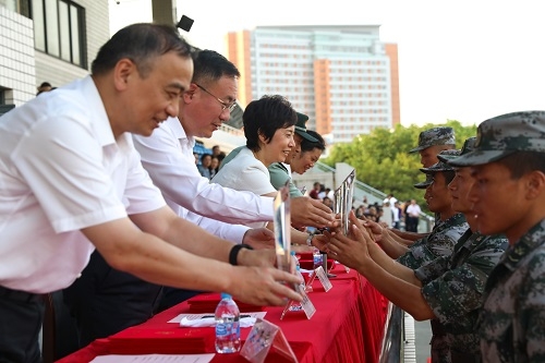 汇报大会上宣布了此次军训的先进集体名单和先进个人名单,与会领导为先进连队和个人颁奖。
