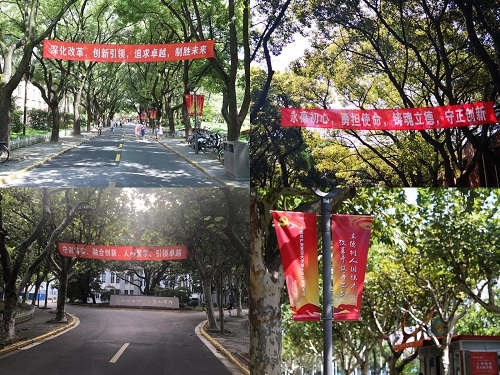 “以习近平新时代中国特色社会主义思想为指导,扎根中国大地办大学”、“立德树人固根本,改革开放再出发”、“守训笃实、融合创新、人心聚学、引领卓越”……囊括路旁的道旗和高高悬挂的横幅,这几日,围绕第十五次党代会而精心筹划的特别布置已然让振奋的气息充盈于复旦园里。