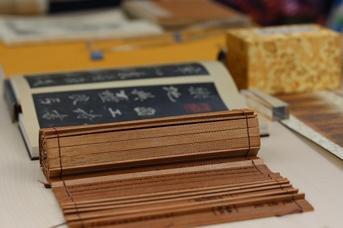 本次曝书会展出了80余种书,不仅有域外汉籍、家谱、藏传佛经等古籍,更以实物的形式完整呈现出了中国古籍装帧史的演变历程。甲骨(仿品)、以马王堆三号汉墓帛书古本为代表的竹简(仿制)、卷轴装光绪元年诰命、经折装《李思训碑》、蝴蝶装《江苏名胜图记》、包背装文渊阁《四库全书·子部·茶经》影印本、木活字本《孙子兵法》等依次排开,呈现出漫长岁月里文献载体因书写、锲刻、刷印、装订方式相异而发生的变迁。此外,古籍常见版本亦于焉可察,现场展有清康熙间刻本《锦字笺注》、清海录轩朱墨套印本《文选》、清咸丰六年石印本《文昌帝劝世宝诰》、巾箱本《四书》、民国七年抄本《新镌部颁监本四书政》……触手可及的古籍实物让同学们加深了对古籍文献体式及版本的理解。