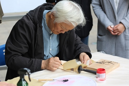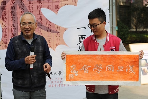 国内顶尖古籍修复专家、研究生院特聘专家赵嘉福在现场为同学们演示传拓。拓包起落间,守护历史文化根脉的赤诚之心应运而生,在同学们的欢呼声中,由他亲手制作的拓片作为奖品赠送给参与答题环节的优胜者。他为获奖同学颁奖,并对曝书会的顺利进行表示祝贺,希望未来曝书会作为复旦大学校园独有的一道风景线,一年一年地传承下去。