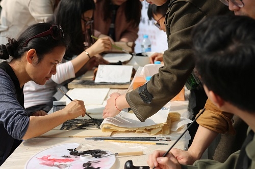 著名版画家、研究院特聘专家倪建明为同学们讲解版画的刷印技艺,从使用工具到如何着墨,从纸张准备到墨色调配,一切都有着可循原则。同学们对倪老师的版画作品惊叹不已的同时,也跃跃欲试,纷纷加入到版画的刷印体验项目中。