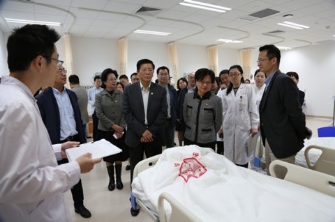 11月1日下午,进博会开幕倒计时4天,进博会医疗卫生保障工作组一线临时党总支授旗仪式暨应急演练在附属华山医院西院(以下简称华山西院)举行。市卫计委党委书记黄红、副书记郑锦、副主任闻大翔,闵行区卫计委党工委书记黄陶承,市医疗急救中心党委书记顾阿荣、各临时党支部书记,以及附属华山医院党委书记顾小萍,副院长马昕、毛颖,党委副书记耿道颖,西院党政班子成员及医院相关职能部门领导出席授旗仪式并观摩演练。