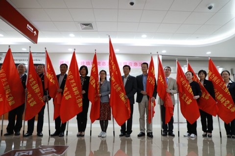 授旗仪式上,郑锦宣读了组建市卫生计生委进博会医疗卫生保障工作组一线临时党总支的决定,黄红向闻大翔和各临时党支部书记授旗。马昕代表附属华山医院接受授旗并宣誓,“迎进博,附属华山医院准备好了!”