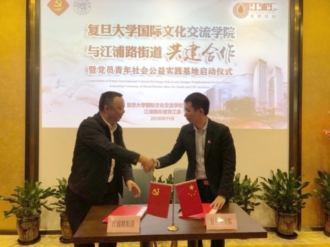 11月16日下午,复旦大学国际文化交流学院与上海江浦街道党工委共建合作正式启动。国际文化交流学院党总支书记王颖、总支副书记郑阳与学院师生代表,江浦街道党工委副书记、办事处主任章爱敏,江浦街道党工委副书记、纪工委书记郑一鸣与社区青年党员代表等,共同出席了双方共建合作暨党员青年社会公益实践基地启动仪式。