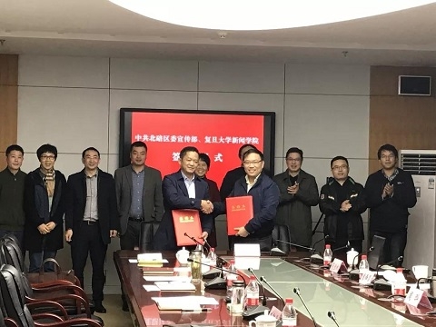 实地学习调研之后,新闻学院与中共北碚区委宣传部在区委举办共建座谈暨联组学习会。会上,双方签署了中共北碚区委宣传部与复旦大学新闻学院深度合作意向书。江绪容、北碚区委宣传部常务副部长张汝国、北碚区文化建设委主任欧阳俊等出席了会议。江绪容代表北碚区委区政府对新闻学院师生的到来表示欢迎,她谈到,复旦和北碚有深厚的渊源,借复旦大学西迁八十周年的契机,要把复旦抗战期间办学的校史文化研究和复旦大学教育培训基地、实习实践基地建设结合起来,做深、做实、做亮,进一步推动市校合作与院区共建“按下加速键,打造升级版”,促进北碚区与复旦大学开展全方位合作。