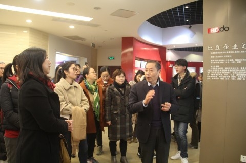 会上,许晓茵代表复旦计算机学院感谢红豆集团的热情接待,并介绍学院前来交流学习的师生党员。顾建清代表红豆集团党委对学院师生的到来表示热烈欢迎,并简要介绍了红豆集团从1957年至今六十年经历的四个发展阶段,以及涉及百姓衣食住行全方位包括服装、橡胶轮胎、生物制药、地产四大产业发展情况,尤其是在红豆集团党委主席周海江带领下的企业党建工作,以及对企业发展的巨大推动作用。全体人员一起观看了红豆创业六十周年的宣传片,片中介绍了红豆集团三代负责人接力下的企业发展史、特色现代企业制度、自主创新品牌与自主融资模式构建、企业党建工作与社会责任制等。邓江作总结发言并详细介绍了红豆集团在产业定位、制度选人、党建发展、打造民族文化企业和倡导社会责任等五个方面的具体实践举措。