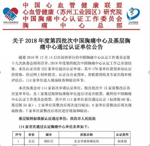 12月14日,附属金山医院打造的“胸痛中心”顺利通过第四批次中国胸痛中心总部及中国基层胸痛中心认证,标志着医院急性心肌梗死等胸痛疾病综合诊疗水平已经达到国家胸痛诊疗标准,走上规范化发展之路。据悉,本次共有222家单位获得参加认证的资格,经过网上材料提交、认证办公室预审、省联盟预检及专家在线审核评估后,179家单位进入现场核查和暗访环节。最终经中国胸痛中心认证工作委员会投票,附属金山医院胸痛中心此次评审终获通过,从此,金山区有了国家级(标准版)认证的胸痛中心医院。
