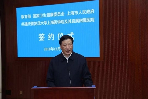 教育部党组书记、部长陈宝生,上海市委副书记、市长应勇,国家卫生健康委员会副主任曾益新出席签约仪式并讲话。教育部党组成员、副部长林蕙青、曾益新、上海市副市长翁铁慧签署共建托管协议。林蕙青主持会议并介绍有关情况。教育部、国家卫生健康委员会相关司局负责同志,上海市人民政府副秘书长宗明和相关部门负责同志出席仪式。复旦大学党委书记焦扬,校长许宁生,常务副校长、上海医学院院长桂永浩,党委副书记、纪委书记袁正宏参加仪式。