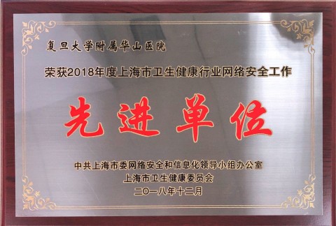 在12月18日举行的上海市卫生健康行业网络安全工作总结暨先进单位表彰大会上,附属华山医院副院长邵建华代表医院上台接受了2018年度上海市卫生健康行业网络安全先进单位的奖状。这是附属华山医院连续第四年获此殊荣,是上海市为数不多的连续多年获此奖项的医院。
