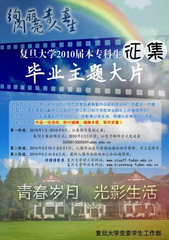 复旦大学2010届毕业生即将离开校园,奔向世界各地。为配合学校毕业生主题教育活动,引导毕业生回顾成长之路,明确奋斗目标,树立“爱国荣校”情怀,传承“团结、服务、牺牲”的复旦精神,立志服务祖国、奉献社会,努力成长为国家和社会的栋梁之材。在毕业季即将来临之际,复旦大学党委学生工作部面向全体2010届本专科毕业生征集毕业主题大片。