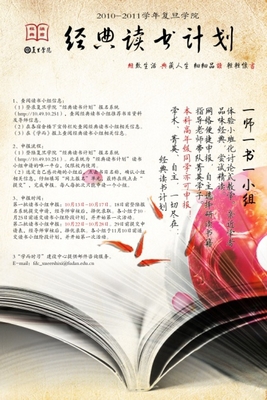 10月13日,2010学年复旦学院“经典读书计划”申报将正式开始。本次活动延续“一师一书一小组”的模式鼓励学生精读好书,提升自我,以书会友。