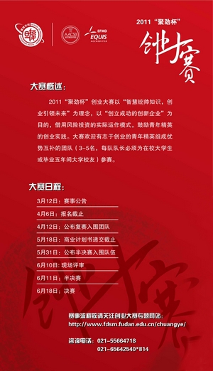 “聚劲”二字意为“聚汇精英,劲赴前程”,“聚劲杯”创业大赛秉持复旦一贯的务实风格和产学结合的特色,不仅关注高新技术产品的创新,而且鼓励营销理念、商业模式等多方面的创新和推广,力求在创业实践的创新中寻找一个更具市场竞争力的契合点。