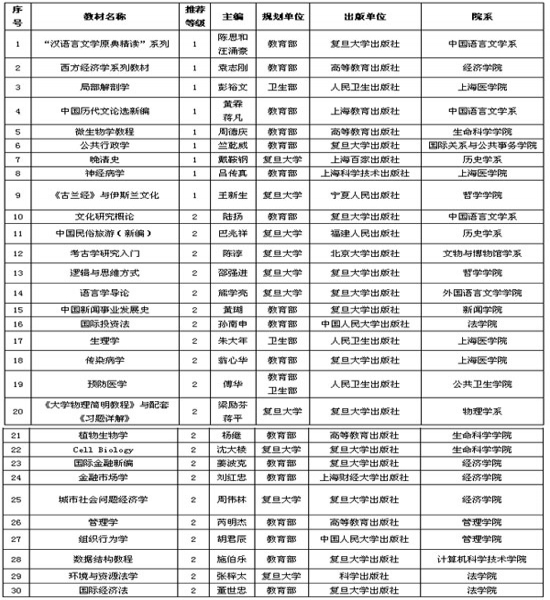 经各教学单位推荐,教务处组织专家评审,拟推荐中国语言文学系 “汉语言文学原典精读”系列教材等30部教材参与申报2011年上海普通高等学校优秀教材奖,具体名单如下: