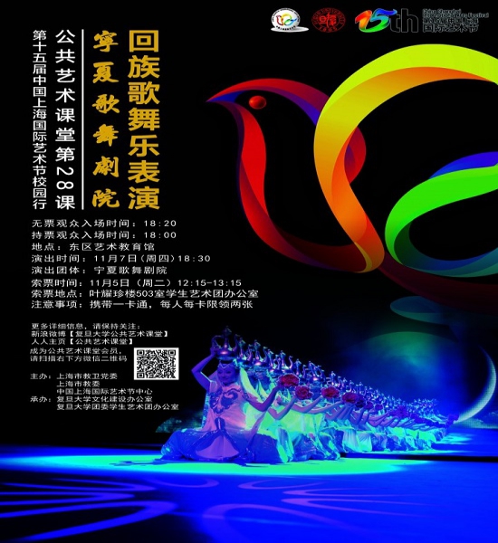 11月7日,受第十五届上海国际艺术节和复旦大学邀请,作为上海国际艺术节校园行的重要组成,“美丽家园——宁夏文化周”宁夏歌舞剧院歌舞乐将走入复旦大学,为广大师生和周边社区居民带来精彩演出。热忱邀请您到场观看!