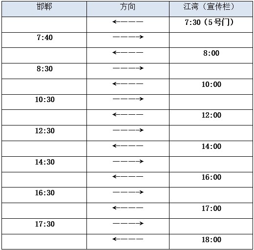 (3)特别提醒:班车从邯郸校区开到江湾校区后照常绕行江湾一圈,在三个经停站(先材楼、五号门路口、双桥)停车,以方便师生就近下车,但由于寒假期间班车间隔时间较长,为避免错过班车停靠时间,请乘坐班车的师生在宣传栏候车。