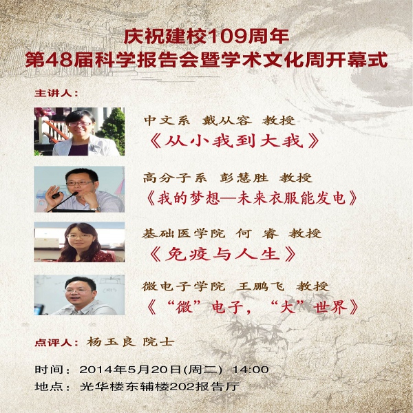 建校109周年第48届科学报告会暨学术文化周开幕式将于2014年5月19日(周二)下午2:00在复旦大学光华楼东辅楼202吴文政报告厅举行,此次报告会邀请文、理、医、工四位青年教师登台作报告,与师生分享自己的学术经历、成长感悟和治学心得。届时将进行网络直播。