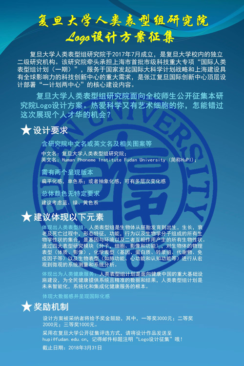 复旦大学人类表型组研究院于2017年7月成立,是复旦大学校内的独立二级研究机构。该研究院牵头承担上海市首批市级科技重大专项“国际人类表型组计划(一期)”,服务于国家发起国际大科学计划战略和上海建设具有全球影响力的科技创新中心的重大需求,是张江复旦国际创新中心顶层设计部署“一计划两中心”的核心建设内容。现面向全校师生公开征集本研究院Logo设计方案。