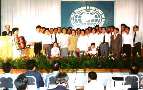 1991年主持上海国际肝癌肝炎会议开幕式时肝癌长期生存病人大合唱