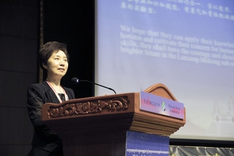 柬埔寨金边皇家大学校长郑杰利致欢迎辞。“澜湄六国是一衣带水的近邻,在自然、人文以及其他诸多方面联系密切,命运紧相连。为了加强保护澜湄流域、造福祖孙后代,流域内国家正在着力推动环境和资源保护、增强工业能力,加强农业和人力资源合作,推进医疗健康合作等国家政策。青年一代是未来真正的主人。柬埔寨青年人口超过全国总人口的60%。推进澜湄教育合作和青年交流是柬埔寨国家政策的核心所在,第四届YICMG大赛正是服务六国国家需求,符合青年发展需求的重要项目。”