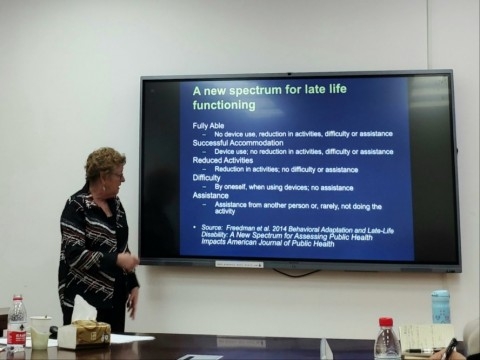 Kasper就其在国家健康和老龄化趋势研究(NHATS)中针对美国8000名老年医疗保险受益人的全国性纵向研究进行了介绍,内容涉及对65岁及以上的老年人残疾界定、老年人失能现状、照护者特征、养老照护偏好以及在概念框架指导下的访谈等方面。据悉,NHATS旨在收集全国65岁及以上Medicare受益人的代表性样本信息,从而能够明确国家残疾趋势和个人发展轨迹,并通过研究来指导残疾预防,最大限度地提高老年人健康、独立运作能力以及生活质量。讲座在双方就失能老人健康及照护问题的热烈探讨中顺利结束。