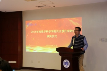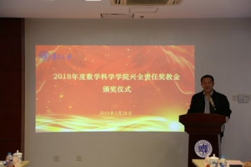 3月28日下午,数学科学学院举行2018年度复旦大学数学科学学院兴全责任奖教金颁奖仪式。上海宁泉资产管理有限公司执行董事杨东,兴业全球基金管理有限公司基金管理部投资总监谢治宇,复旦大学高等学术研究院院长陈晓漫,对外联络与发展处副处长恽小婧,数学科学学院党委书记王永珍,以及获奖教师出席颁奖仪式。数学科学学院党委副书记刘建峰主持颁奖仪式。