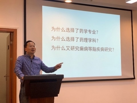 会上,陈忠给同学们讲述他的药学人生故事。陈忠来自浙江,出身医生世家,从小立志学医,以优异成绩考入上海医科大学学习药学,在复旦药学院学习了五年本科课程,毕业后留学日本冈山大学学习药物学专业主修神经药理学,回国后在浙江大学工作,目前从事癫痫等脑疾病的研究。他特别讲到了家乡温州“千山万水、千辛万苦、千言万语、千方百计”的四千精神和缙云的“梅干菜精神”对他产生的巨大影响,使他受益至今。