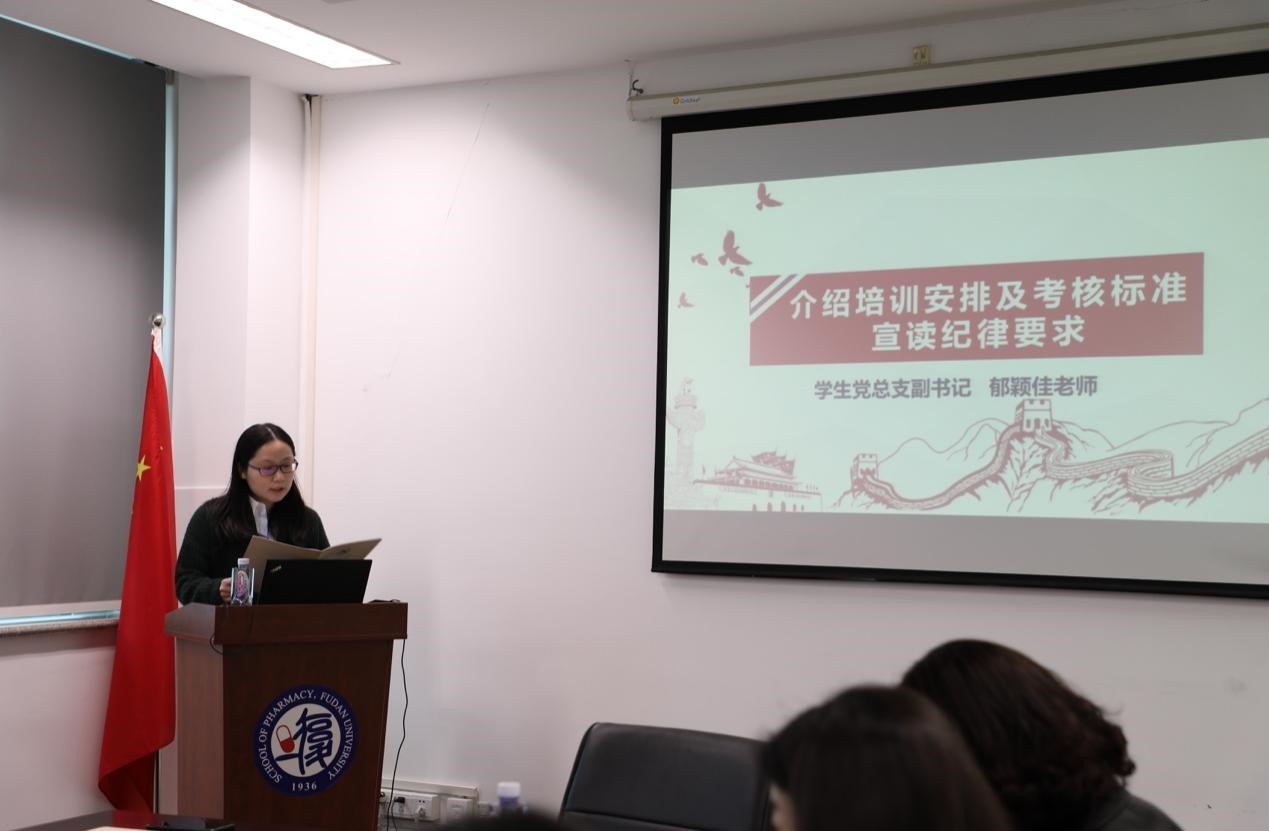 4月13日上午,药学院第一期入党积极分子培训班正式开班。药学院党委副书记史雪茹、王宁宁,学生党总支副书记郁颖佳,以及学生办公室的各位老师参加开班仪式。
