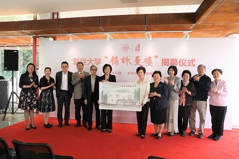 焦扬、左焕琛、杨咏曼和邓秉钧伉俪共同为“杨咏曼楼”揭幕。焦扬代表复旦大学向杨咏曼赠送“杨咏曼楼”手绘画幅作为纪念。
