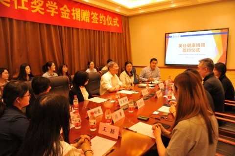 6月14日,复旦大学多个院系师生代表和英仕健康人员相聚公共卫生学院,举行“复旦大学英仕奖学金”捐赠仪式,共同探讨校企合作。
