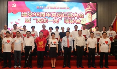 为庆祝中国共产党成立98周年,深入学习“不忘初心、牢记使命”主题教育精神,进一步增强党员党性意识,发挥党组织战斗堡垒作用和党员先锋模范作用,6月27日,附属金山医院召开庆祝建党98周年党员红歌大会暨“两优一先”表彰会。会议特邀区卫健工作党委副书记褚连芳担任红歌大会主评委,附属金山医院院长沈辉、区政协委员、区人大代表、民主党派代表、海外人士、群众代等出席并担任评委,全体党员参加会议,附属金山医院党委书记陈刚主持会议。