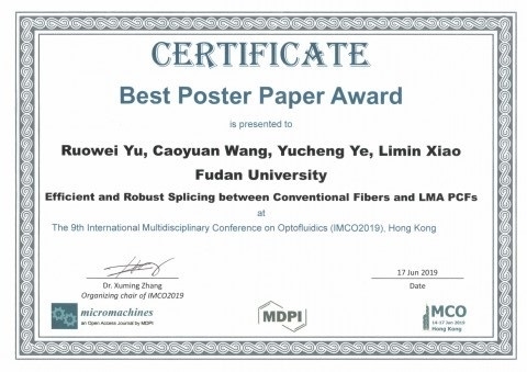 另外,由肖力敏指导的研究生于若玮同学的海报文章“Efficient and robust splicing between conventional fibers and LMA PCFs”获最佳海报奖。该研究突破了困扰已久的大模场光子晶体光纤的在实际应用中熔接难题,通过新型反向拉锥法,实现熔接后的插入损耗小于0.5 dB, 单点熔接损耗小于0.25 dB,且因精密的光纤后处理技术,光纤外包层实现匹配,熔接强度也非常高。这一技术飞跃将极大地促进大模场光子晶体光纤在高功率脉冲激光传输、超连续谱光源、相干反斯托克斯拉曼散射显微光纤成像等激光与生物医学领域的应用。