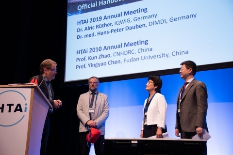 在6月19日的闭幕会上,新当选的HTAi主席Iñaki Gutierrez-Ibarluzea宣布,下一届HTAi年会将于2020年6月20日至24日在北京召开,由国家卫生健康委卫生发展研究中心与复旦大学共同承办此次会议。在交接仪式上,陈英耀和国家卫生健康委卫生发展研究中心教授赵琨作为承办方代表发言。陈英耀在发言中简要回顾了HTAi在中国的发展历程,特别提及David Banta1990年代将HTAi引入中国,陈洁于1994年在上海医科大学创立了国内第一家卫生技术评估研究中心,为中国HTAi的发展做出了开创性贡献。