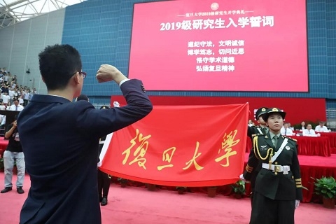 “胸怀远大理想,关注人类命运,忠于祖国,热爱人民,探求真知,遵纪守法,文明诚信,博学笃志,切问近思,追求卓越,恪守学术道德,弘扬复旦精神,为学校争光添彩,为国家贡献力量!” 全场新生在研究生会主席、化学系2016级直博生朱嘉星的带领下庄严宣誓。在主席台前排就座的校领导和老师亲切地为新生代表佩戴上校徽。从此,大家拥有了一个共同的名字——“复旦人”。
