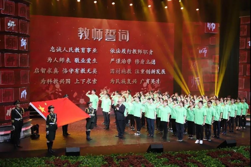 活动尾声,2019年全国最美教师、上海市教育功臣、同济大学教授郑时龄带领400位新教师庄严宣誓:“忠于人民教育事业,依法履行教师职责,为人师表敬业爱生,严谨治学修身立德,启智求真恪守有教无类,因材施教注重创新发展,为科教兴国上下求索,为民族复兴广育英才。”