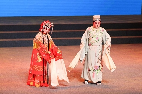 就在诵读会前3天,9月23日晚,作为复旦大学戏曲进校园活动的组成部分,由复旦大学党委宣传部、杨浦区委宣传部、杨浦区文化和旅游局联合举办的大型戏曲晚会“九州百戏·盛世华章——全国戏曲经典名段演唱会”同样登上了相辉堂的舞台。“天上掉下个林妹妹”(越剧《红楼梦》)、“刘大哥说话理太偏”(豫剧《花木兰》)、“树上的鸟儿成双对”(黄梅戏《天仙配》)……一段段来自于新中国成立以来各地戏曲经典剧目的名曲表现和传承着中华优秀传统文化,成为了又一项面向70周年华诞的特别献礼。