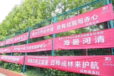 “远征社:用爱丈量祖国河山”“龙狮协会:龙腾五千载,狮醒七十年”“天文协会:遍历四方星辰,心系九州大地”……因9月24日复旦大学学生社团表白祖国主题嘉年华暨2019学年秋季学期社团招新活动而留下的众多横幅仍集中悬挂于本部篮球场、排球场。用青春活力向祖国母亲大声倾诉的火热气氛犹历历在目。