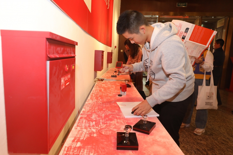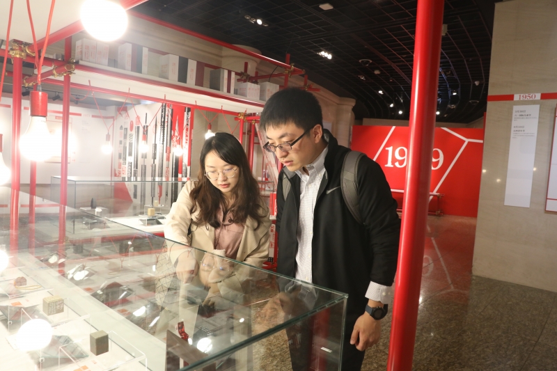 展览犹如时光隧道,一枚枚精美的印章重温了中华人民共和国成立、第一颗原子弹爆炸成功、东方红一号成功发射、改革开放、一国两制这一个个里程碑事件;的确良、新华字典、九年义务教育、复兴号、北京奥运、5G这些熟悉的名词和它们背后的时代故事深深地吸引了复旦观展师生的目光,大家认真听取讲解、不时停下脚步仔细观看。