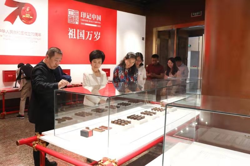 在庆祝中华人民共和国成立70周年之际,为更好地推进复旦大学“三全育人”综合改革试点,进一步推动艺术教育与德育相结合,大力弘扬中华优秀传统文化教育,10月8日,校党委书记焦扬率领复旦师生代表前往北京中华世纪坛艺术馆,参观“印记中国(1949-2019)——庆祝中华人民共和国成立70周年大众篆刻作品展览”。校党委副书记尹冬梅共同参观展览。