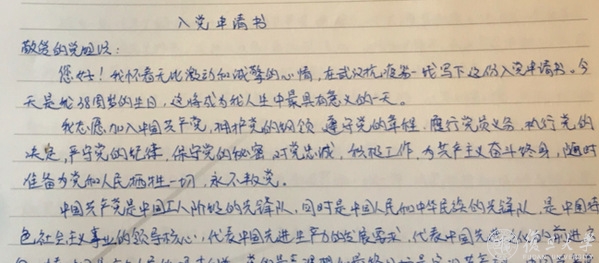 2月23日,她递交了入党申请书:“作为一名驰援武汉的护理人,带领着100位护理同仁,深感责任重大。在这个非常时期,面对疫情蔓延的严峻考验,身边的党员同志模范带头给了我巨大的勇气,更加坚定了我为党为人民尽职尽责的信念。用实际行动践行誓言,接受党组织对我的考验!”