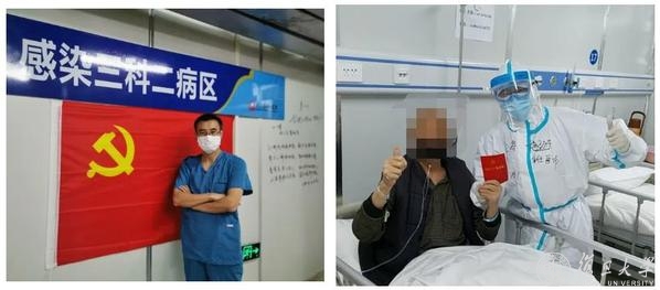(党员的先锋模范作用不止会“传染”给医生和护士,还会“传染”给病人。在隔离病房中,除了医生、护士和病人,就没有别的人了。病人所有的治疗和生活起居,全部是护士承担。我们的护士非常辛苦,脸上带着护目镜、面屏、N95口罩、外科口罩,身上穿着手术服、隔离衣、防护服,脚上两个鞋套,手上至少两层手套,一干就是四个小时。他们的辛苦,病人也都看在眼里,记在心里。我们病房有一位93岁的老先生,有一次查房他拿出共产党章程,说“上海的医生和护士对我实在太好了,我要感谢你们,感谢中国共产党,我也要加入中国共产党”。新冠病毒传播的是一种可怕的疾病,而我们党,在这次抗疫战争中,传播给我们的,是一种众志成城的伟大精神,一种战无不胜、带领全国各族人民实现伟大中国梦的精神!)